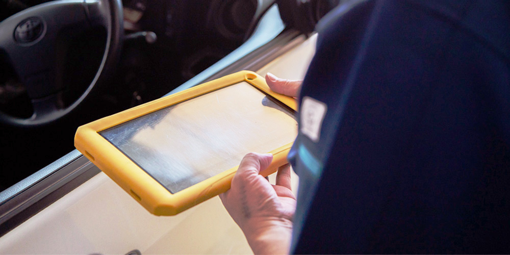 専用ツールで車両と接続し、カメラの調整作業を行います。