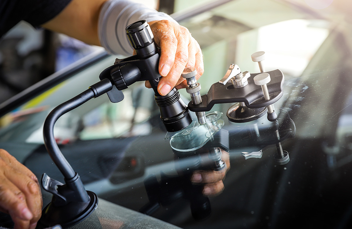 飛び石などで傷付いたガラスの修理には、ひび割れの中に入ってしまった空気を抜き、レジンを入れる作業を行います。